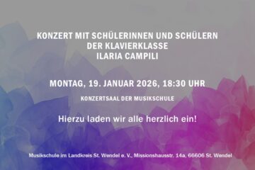 Liebe Schülerinnen und Schüler, liebe Eltern, von Montag, 22. Dezember, bis Sonntag, 4. Januar bleibt die Musikschule aufgrund der Weihnachtsferien geschlossen.Ab Montag, 5. Januar, sind wir wieder wie gewohnt für Sie da und freuen uns Weiterlesen