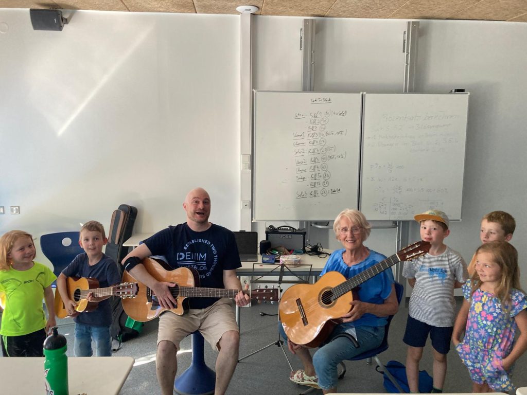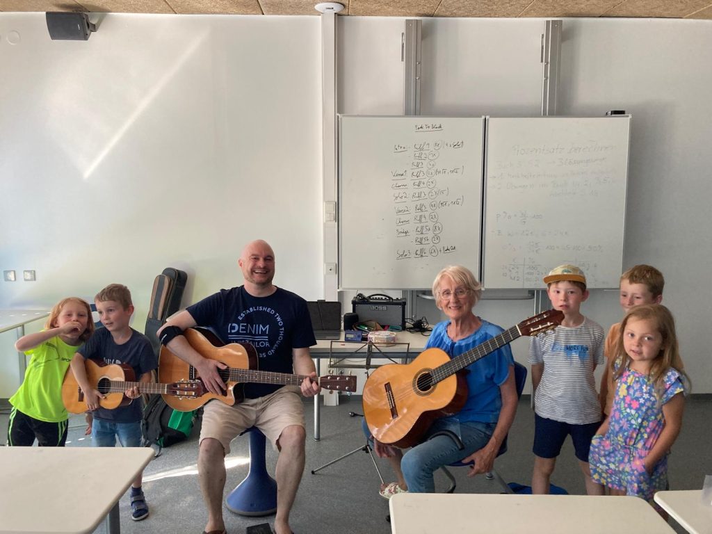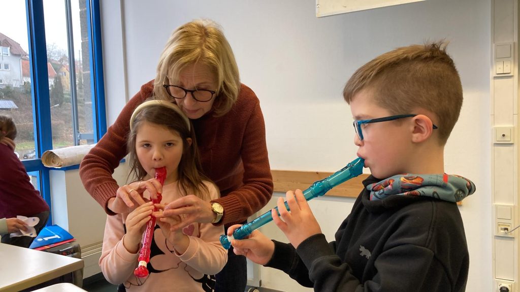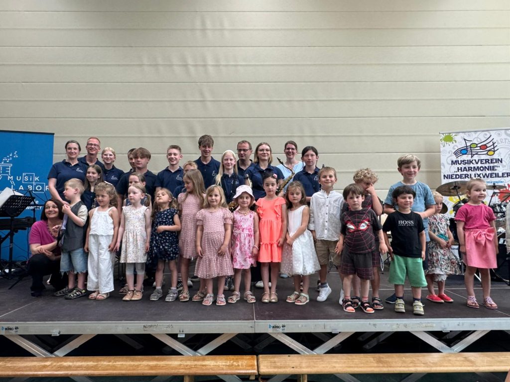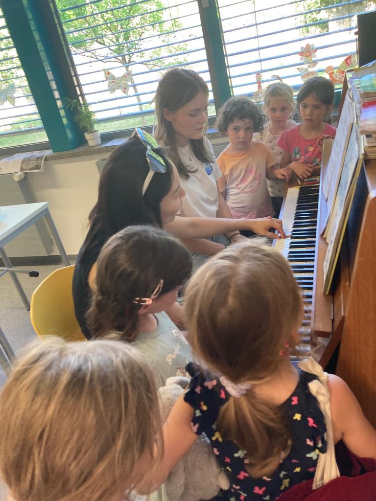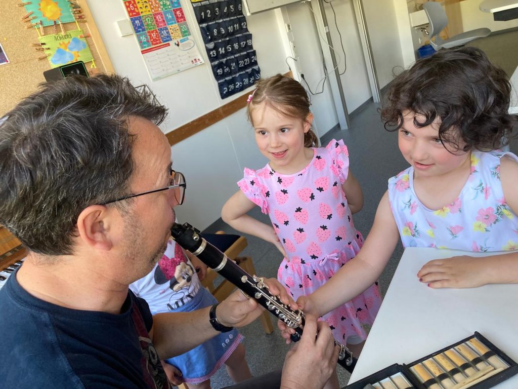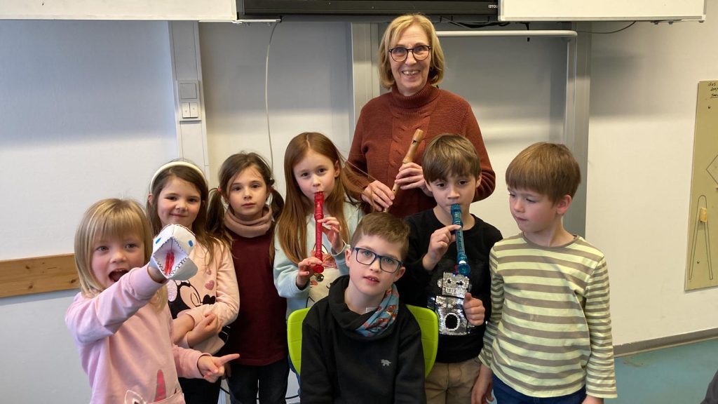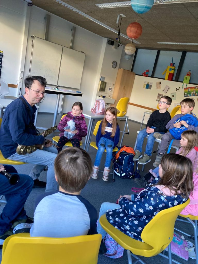 Besuch der Gruppe „Musikalische Früherziehung“ Marpingen, Klasse Angelika Maringer, bei Claudia Studt-Schu, Flötenlehrerin, Benny Strauß, Gitarrenlehrer, Jürgen Brill, Klarinetten- und Saxophonlehrer, Youngwha Jeon, Klavierlehrerin. der Musikschule:
